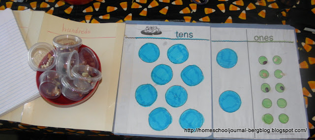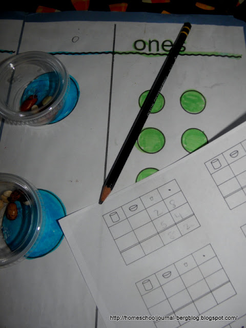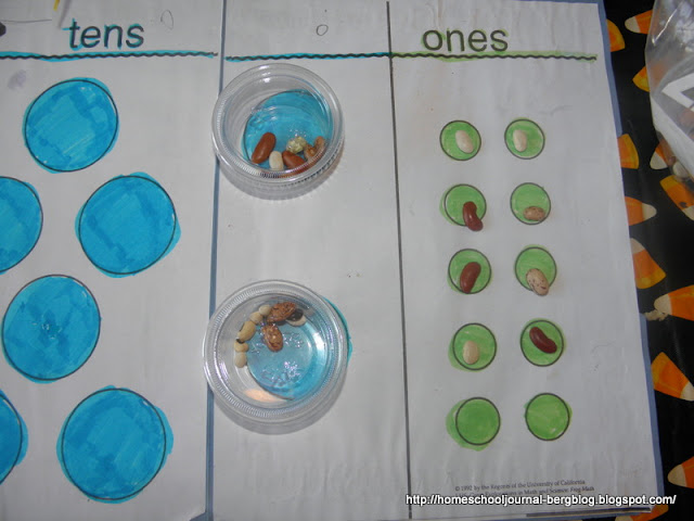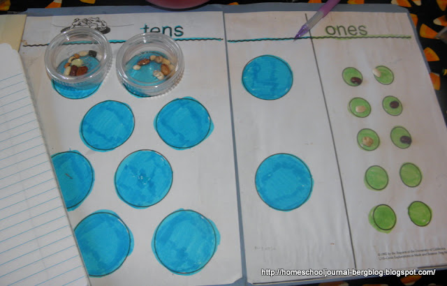 We then filled in the answer on a chart. He will do this hands-on regrouping for a time and then when he feels he wants to fill out the chart without using the beans, I will show him the more traditional way of carrying. By this time, it will seem obvious or second-nature to carry, or change the ones into tens as needed.
