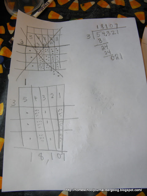 We began by dividing this amount (54,321) by three. We began by starting at the ones/green column, making trades from the left, as needed. It wasn't too long before he discovered that this method did not work well for him.