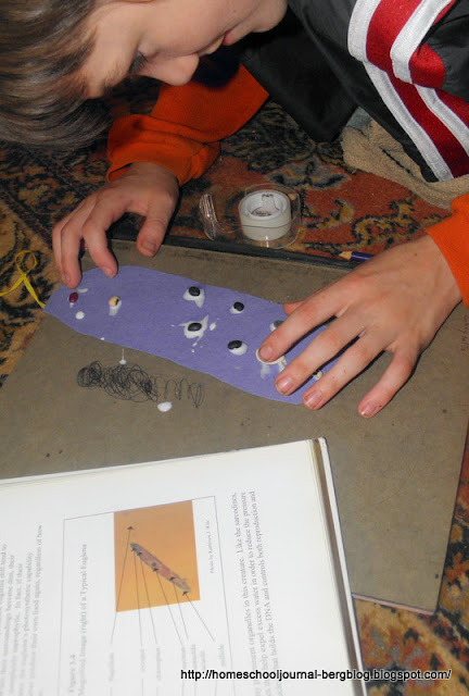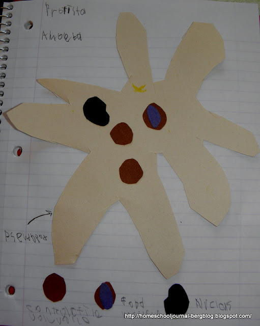 Alex's Amoeba is cut of of construction paper free-hand and then the organelles were cut out of different colored construction paper and glued on. He made similar ones for the bottom to make a key.