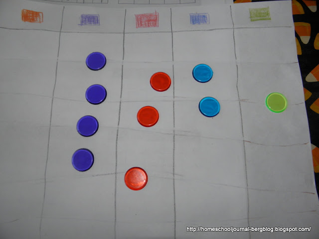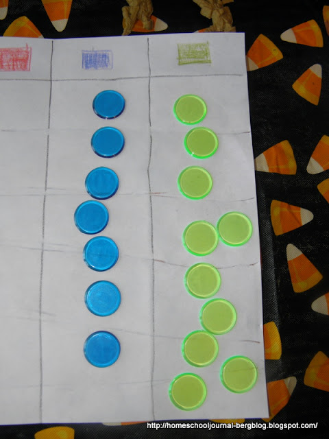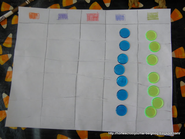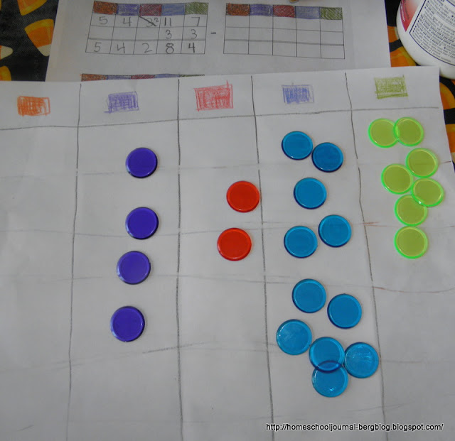 James has also made the transition from working with chips instead of beans with his work in advanced division. I first asked him to put five orange chips, four purple chips, three red chips. two blue chips and one green chip on the new trading board.