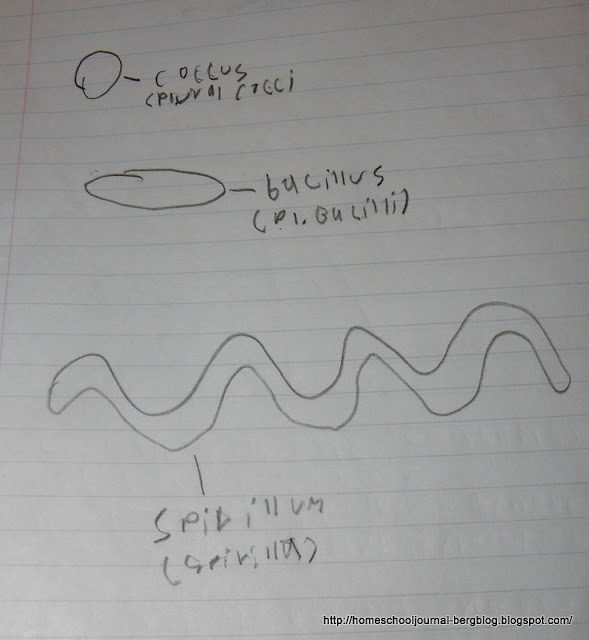 We have also been learning about Monera (bacteria), including that part of the way we classify them is by their shape. We also set up a bacteria experiment to show how important it is to wash hands that we found in the Handbook of Nature Study. I will be posting about it soon.