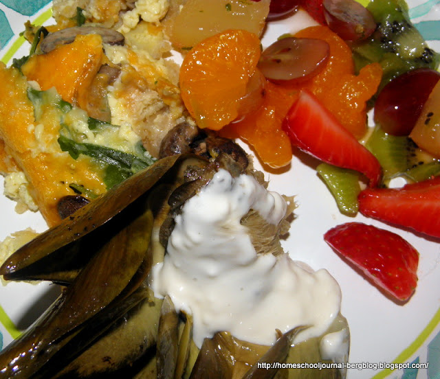 | Spinach and Mushroom Quiche, Fresh Honey-Lime Fruit Salad and Artichoke Hearts with Lemon-Mayo sauce. Not pictured, French Bread. |