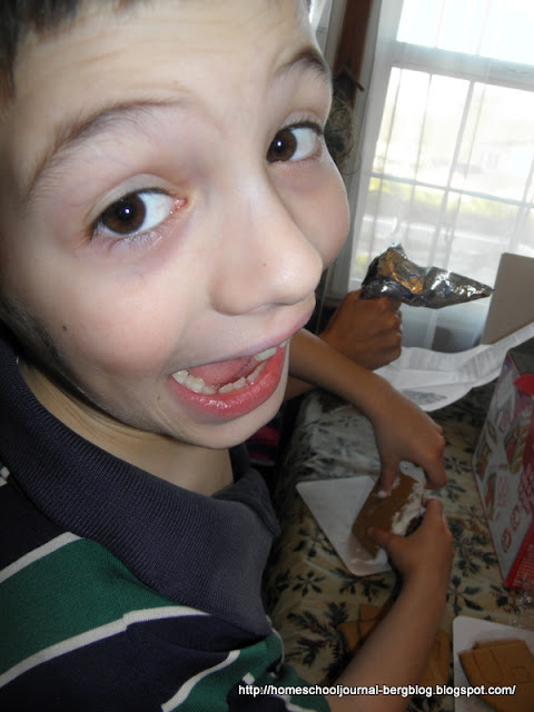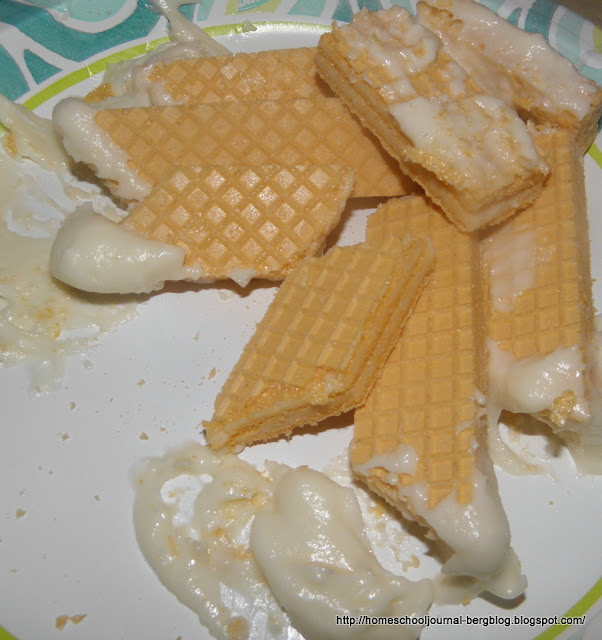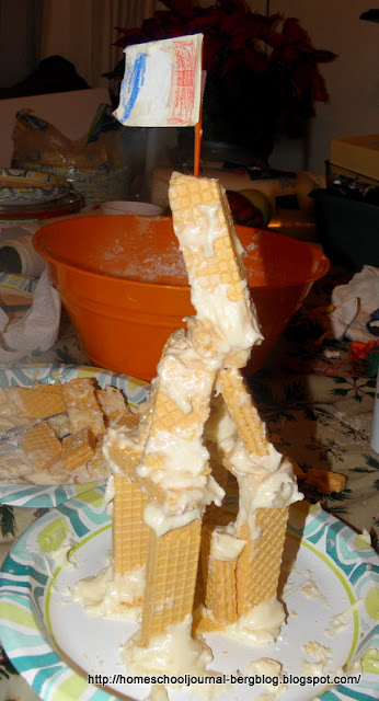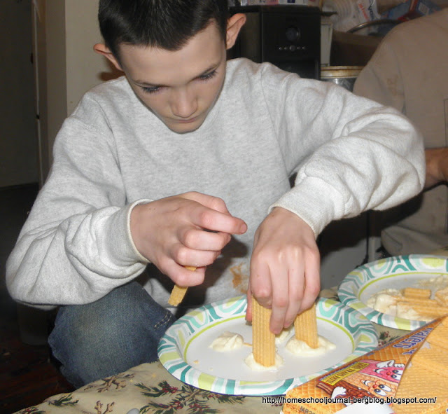 Sometimes I wonder if all these hands-on activities are worth it. I mean, what does it teach them to make a edible model of the Eiffel Tower? Then, I see them actually do it and even if you don't count all the building and perseverance skills that were put to the test, think of all times they looked at a picture of the Eiffel Tower to make this as much like it as possible. I certainly think that they have that picture in their heads forever and have a greater appreciation for what it took to build it. Discussions of what the building is really made of and how it was built went on during the cookie construction.