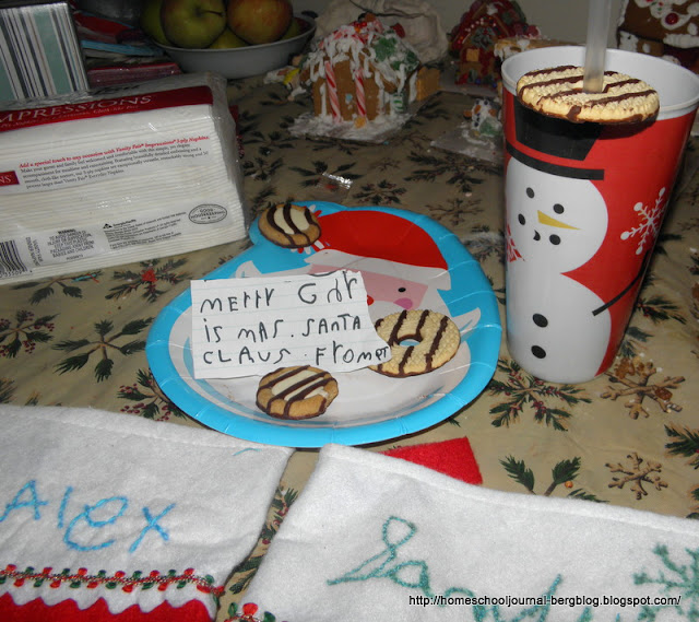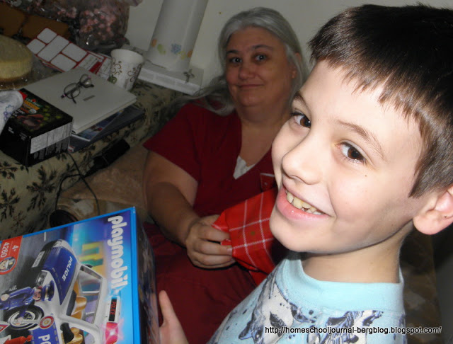 Christmas Eve gifts of new pajamas, Christmas ornaments cross-stitched by Grandma B. and Secret Santa gifts unwrapped.