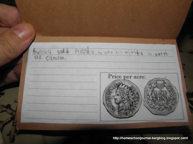 | lapbook piece from Homeschool in the Woods, James' (age 11), "Russia sold Alaska to the US. Alaska is north of Canada." |